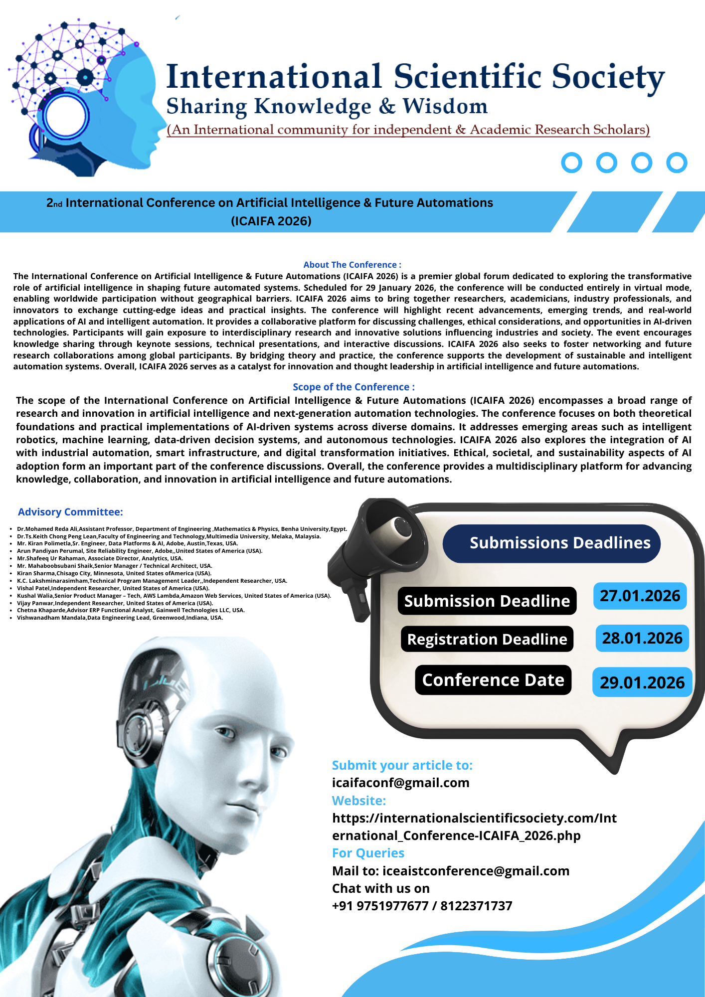 The International Conference on Artificial Intelligence & Future Automations (ICAIFA 2026) is a premier global forum dedicated to exploring the transformative role of artificial intelligence in shaping future automated systems. Scheduled for 29 January 2026, the conference will be conducted entirely in virtual mode, enabling worldwide participation without geographical barriers. ICAIFA 2026 aims to bring together researchers, academicians, industry professionals, and innovators to exchange cutting-edge ideas and practical insights. The conference will highlight recent advancements, emerging trends, and real-world applications of AI and intelligent automation. It provides a collaborative platform for discussing challenges, ethical considerations, and opportunities in AI-driven technologies. Participants will gain exposure to interdisciplinary research and innovative solutions influencing industries and society. The event encourages knowledge sharing through keynote sessions, technical presentations, and interactive discussions. ICAIFA 2026 also seeks to foster networking and future research collaborations among global participants. By bridging theory and practice, the conference supports the development of sustainable and intelligent automation systems. Overall, ICAIFA 2026 serves as a catalyst for innovation and thought leadership in artificial intelligence and future automations.